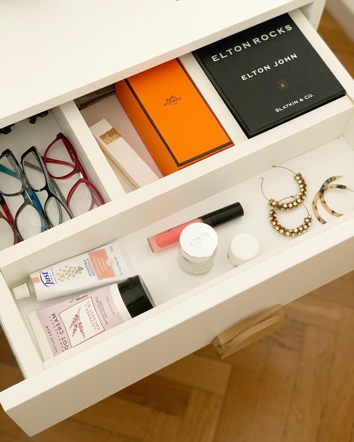 Mesa de luz laqueada en color a elección terminación semi-mate, con dos cajones y base en petiribí. Tiradores en petiribí en forma de semi-círculo.