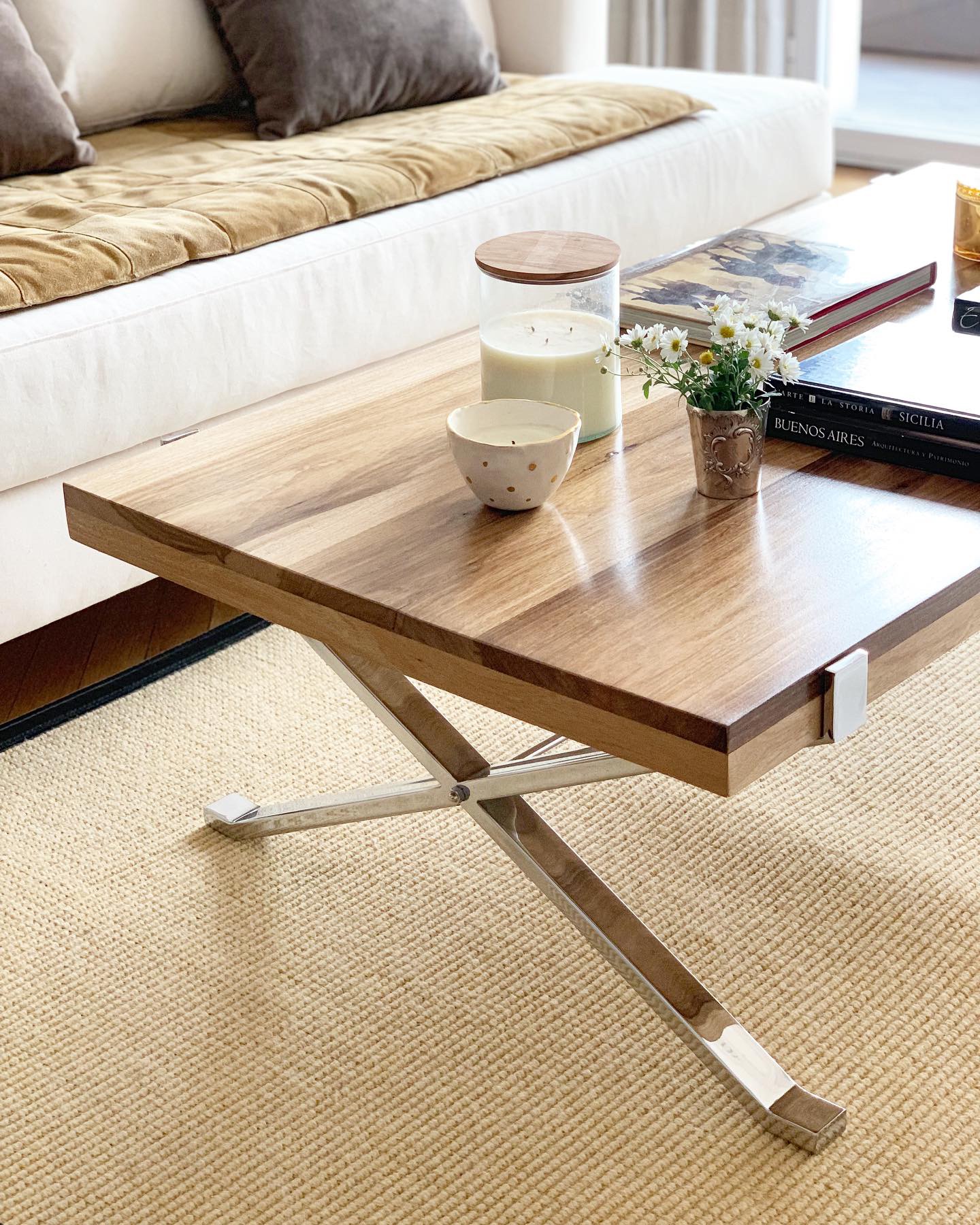 Mesa baja rectangular con tapa en madera de petiribí y base cromada.