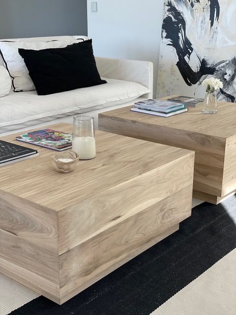 mesas ratonas cuadradas realizadas en madera enchapada de petiribi. La terminación de la madera es natural.