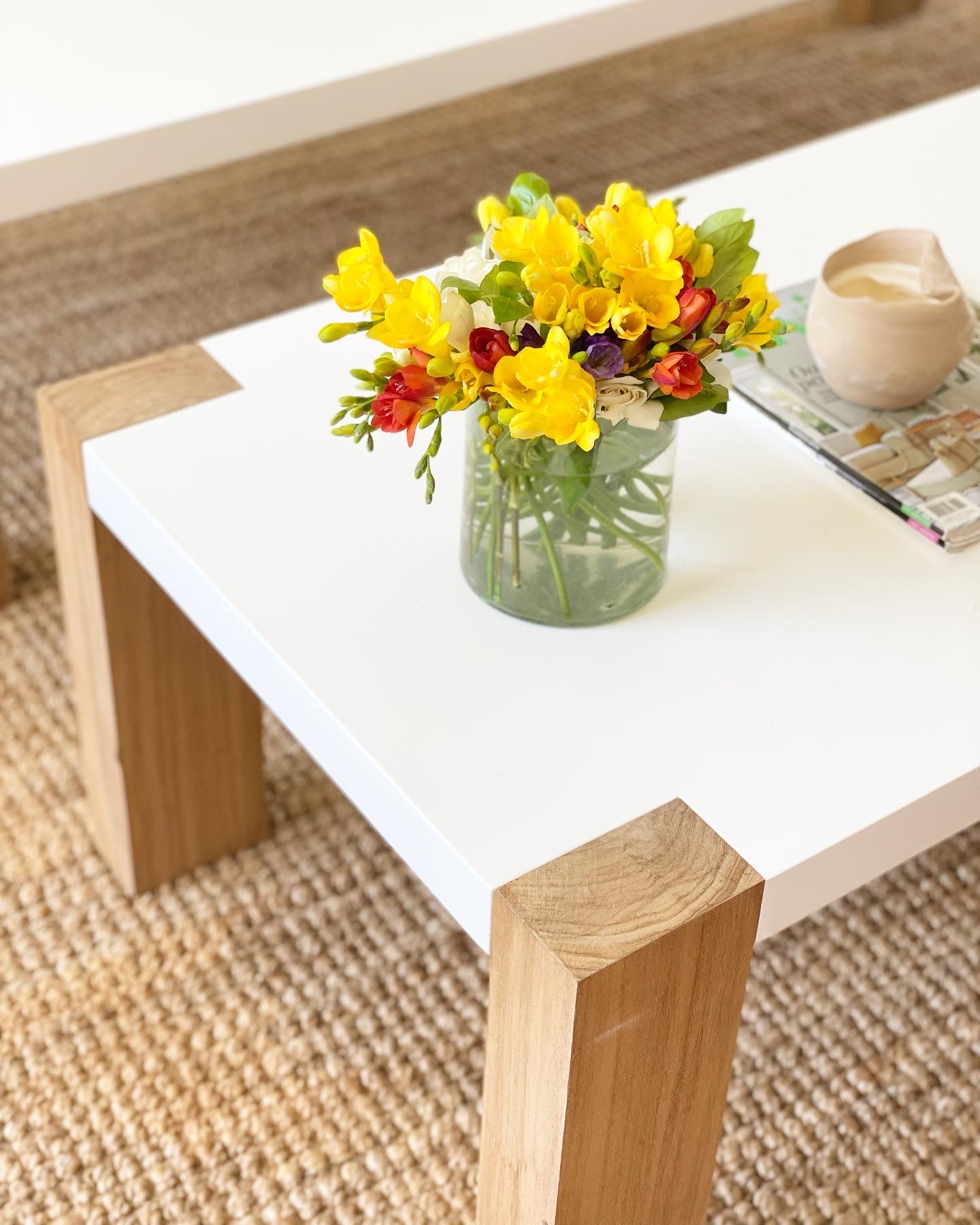 Mesa baja rectangular con tapa laqueada en color a elección y patas en madera de petiribí con encastre a la vista.